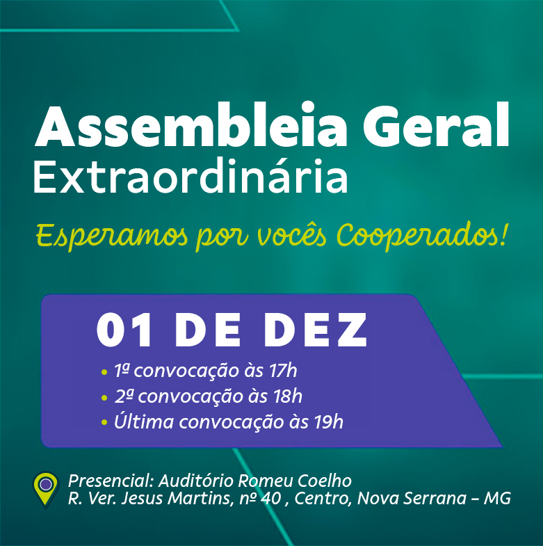 Este ano, a Assembleia Geral Extraordinária será realizada no dia 01 de dezembro com última chamada às 19h no Auditório Romeu Coelho, do Sicoob Credinova, situado à Rua Vereador Jesus Martins, 40, Centro - Nova Serrana - MG.