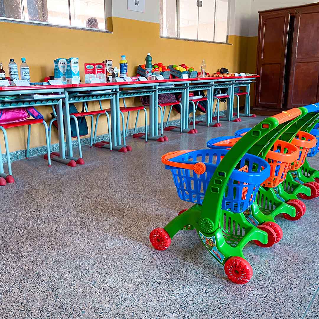 Para simular o comércio, foram colocadas embalagens vazias de produtos que são encontrados no mercado, como caixas de leite, água, iogurte e réplicas de frutas e lanches. Separados em pequenos grupos, cada um deles recebeu R$ 500 em dinheiro fictício para ir às compras e também pagar contas de água e luz. Outros dois estudantes escolhidos pelo professor ficaram responsáveis pelo recebimento das compras e das faturas.