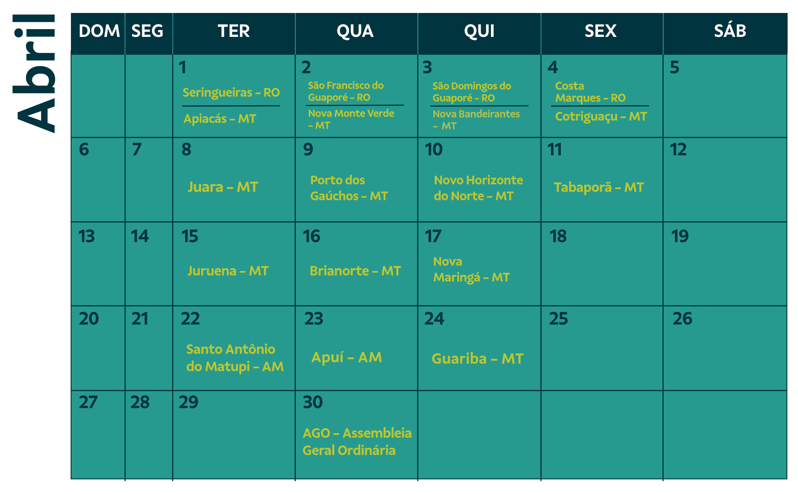 A rodada de pré-assembleias da Sicoob Credip 2025 começa na próxima terça-feira (11) em Santa Luzia do Oeste (RO). Na sequência, o evento passará por São Felipe do Oeste, Parecis e Rolim de Moura, seguindo por diversas cidades até o encerramento, no dia 24 de abril, no distrito de Guariba (MT). Os encontros serão realizados presencialmente em todas as regiões onde a cooperativa atua nos estados de Rondônia, Amazonas e Mato Grosso. Confira o calendário completo abaixo.