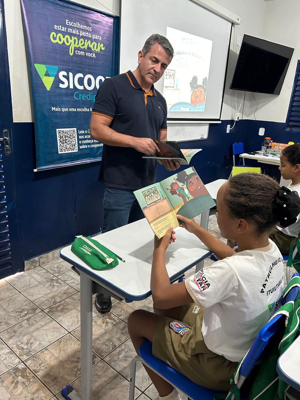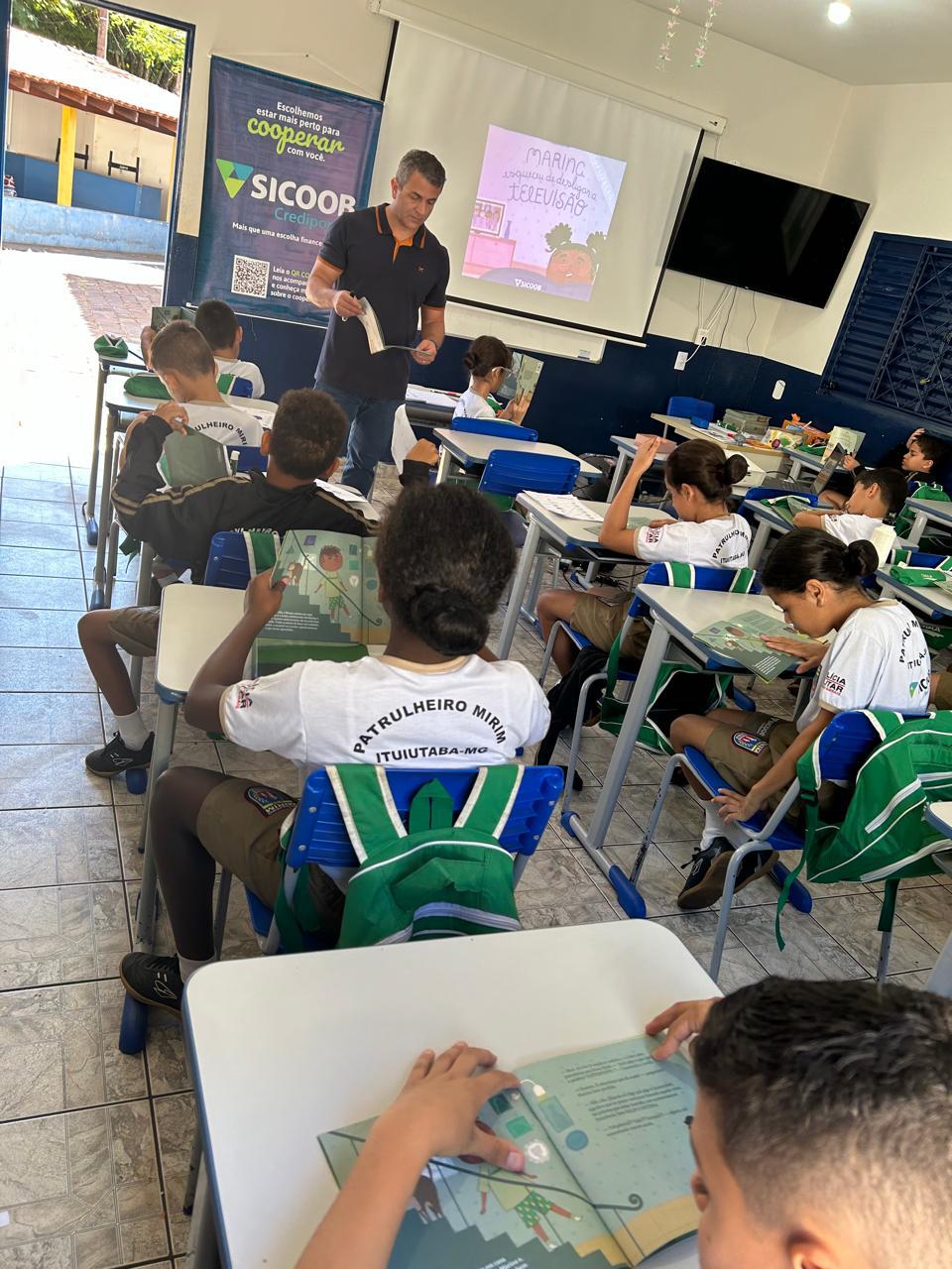 Para encerrar as atividades da Semana ENEF, as turmas do Projeto Patrulheiro Mirim, uma iniciativa da Polícia Militar composta por crianças de 8 a 12 anos, receberam o livro e a contação da história "Marina esqueceu de desligar a televisão" do Instituto Sicoob, realizada pelo nosso Diretor de Negócios e Produtos, Uiliam dos Santos, que também atua como professor voluntário na disciplina de Educação Financeira no Projeto.
