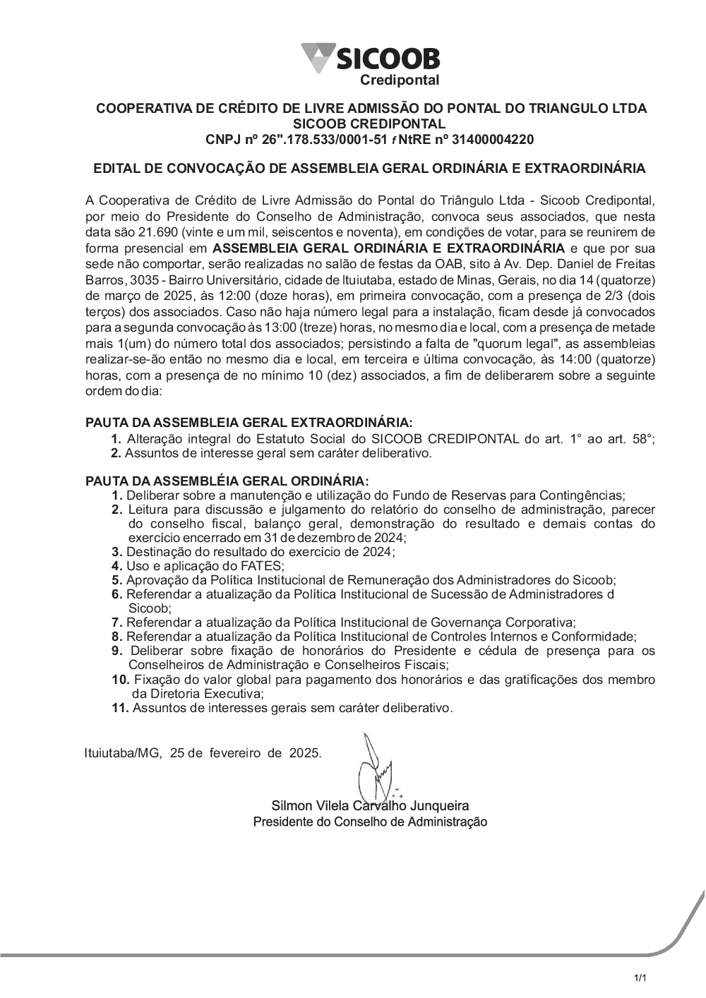 SICOOB CREDIPONTAL - EDITAL DE CONVOCAÇÃO 2025