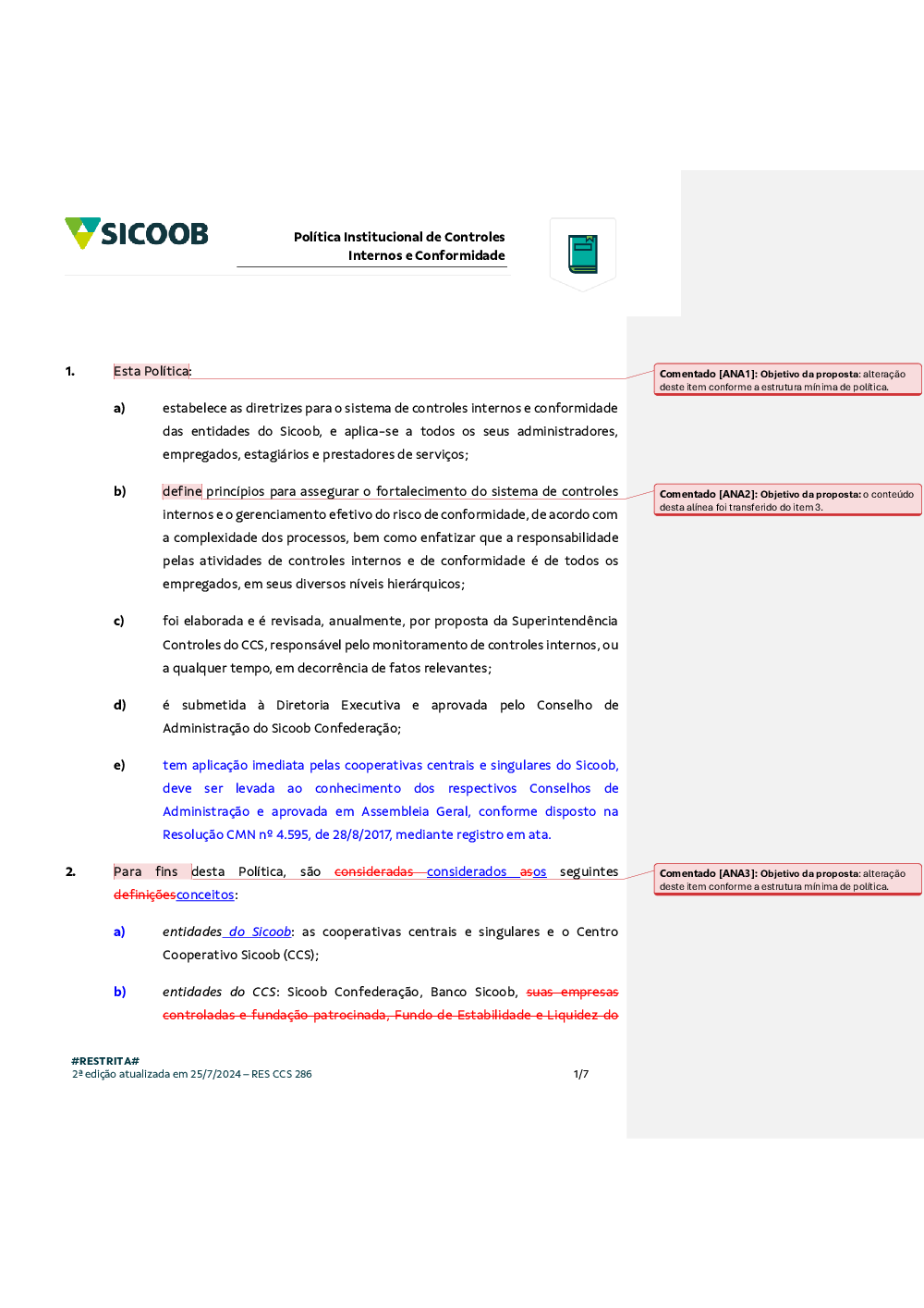 Alterações da Política Institucional de Controles Internos e Conformidade