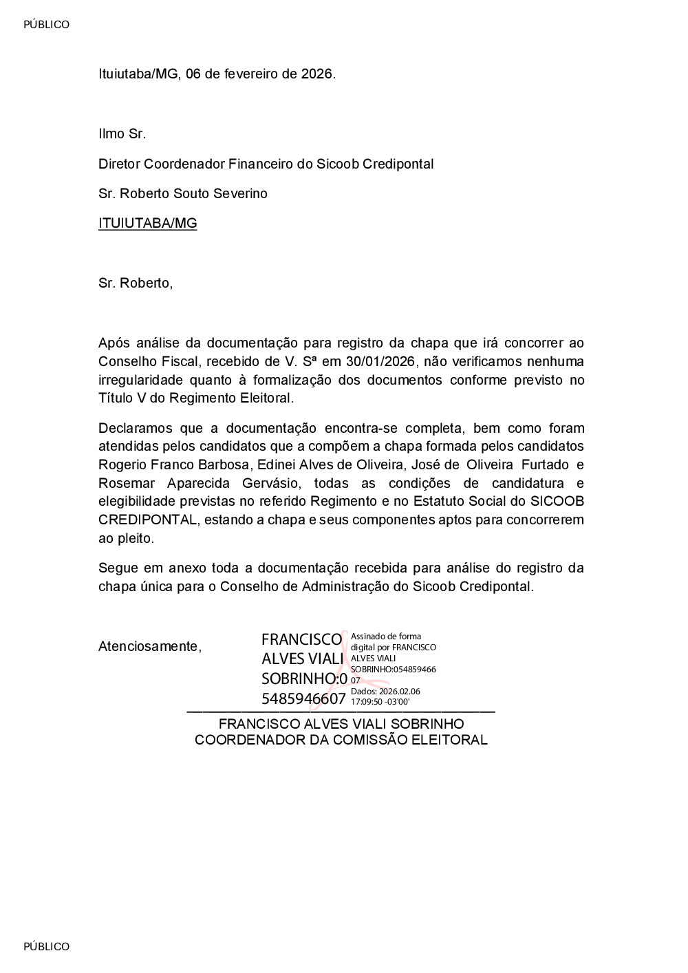 Carta da Comissão Eleitoral ao Diretor Coord. Financeiro