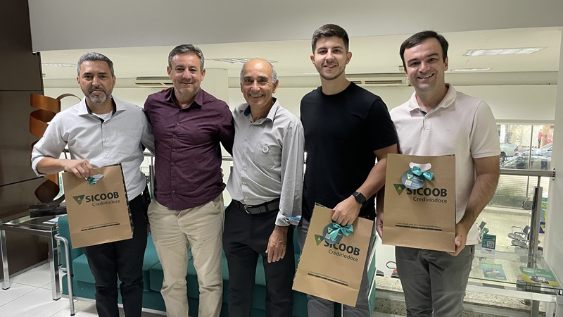 Na foto estão da esquerda para direita: Anábio Marciano gerente administrativo do Sicoob Crediverde, Leno Gontijo diretor administrativo, Silas Dias Costa Junior, diretor de negócios do Sicoob Crediriodoce, Guilherme Alvarenga, gerente de negócios e Geovane do Carmo, analista de compensação.