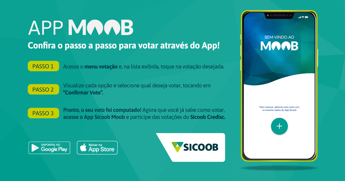Baixe em seu aparelho celular ou tablet, o aplicativo “Sicoob Moob”, disponível para download, gratuitamente, nas lojas Apple Store e Google Play.