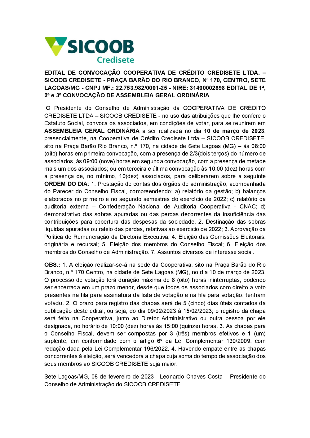 Informações, documentos e materiais oficiais relacionados à Assembleia Geral Ordinária do Sicoob Credisete.