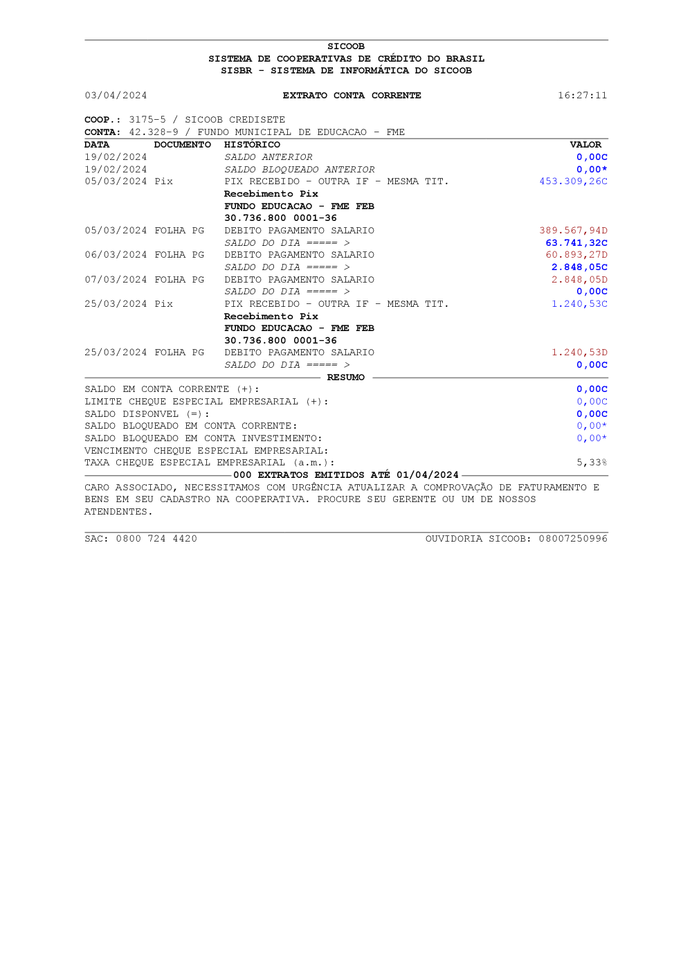 CONTA: 42.328-9 / FUNDO MUNICIPAL DE EDUCACAO - FME