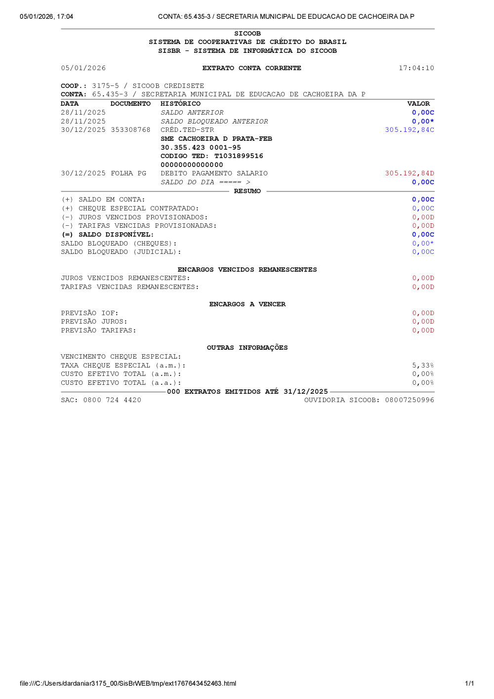CONTA: 65.435-3 / SECRETARIA MUNICIPAL DE EDUCACAO DE CACHOEIRA DA P