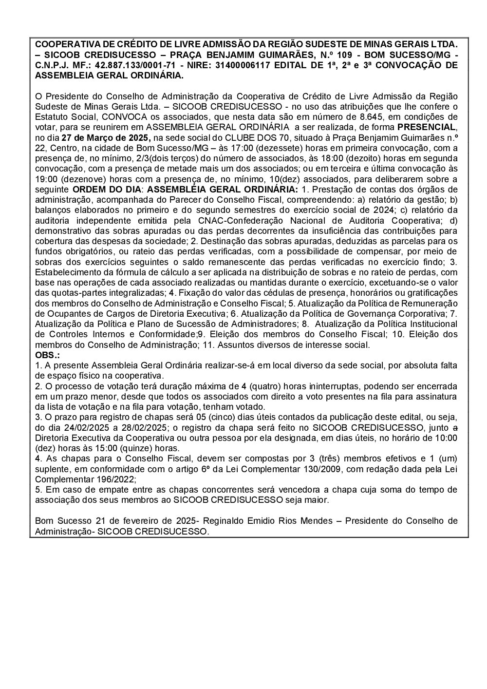COOPERATIVA DE CRÉDITO DE BOM SUCESSO LTDA – SICOOB CREDISUCESSO – PRAÇA BENJAMIM GUIMARÃES, N