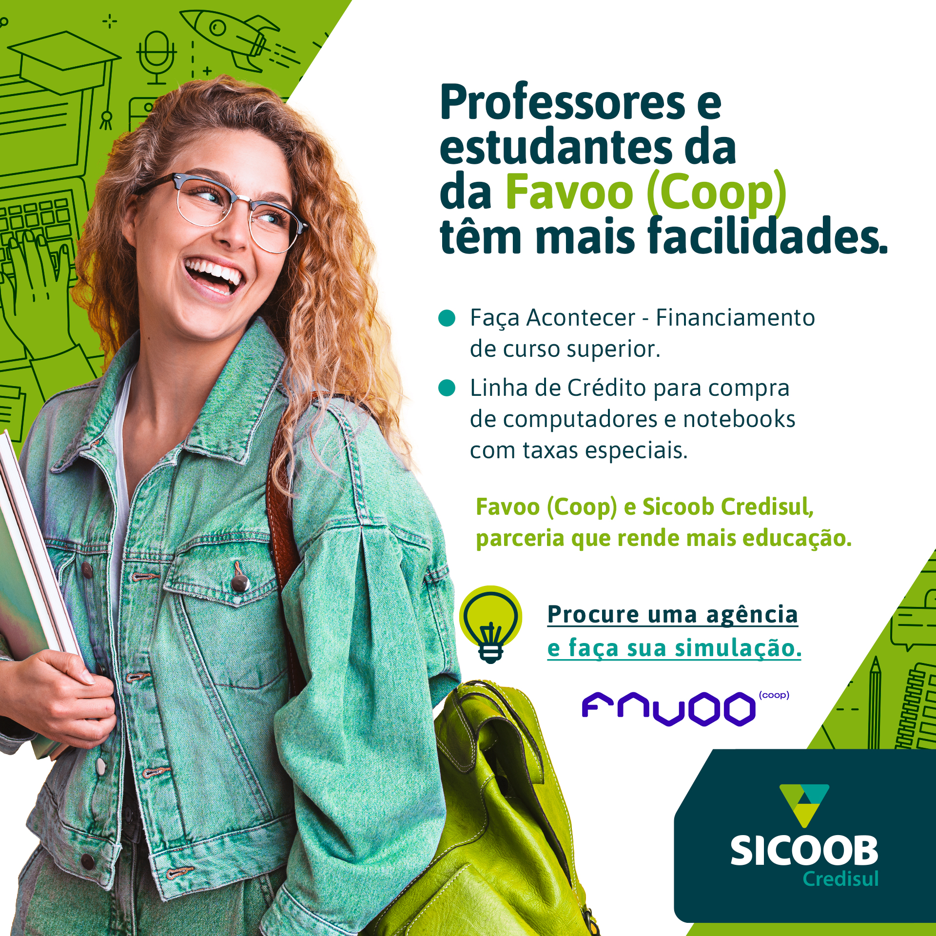 Entendendo a realidade educacional desses universitários, a Sicoob Credisul passou a oferecer dois tipos de financiamento. O primeiro deles é a linha de crédito exclusiva para estudantes e professores da Favoo (Coop) que desejam financiar notebooks ou computadores para aprimorar sua graduação ou capacitação. Pensando em contribuir com o acesso a uma educação de qualidade, a cooperativa traz taxas especiais pós-fixada de 0,60% ao mês CDI e pré-fixada 1,60% ao mês, com parcelamento em até 48 vezes.