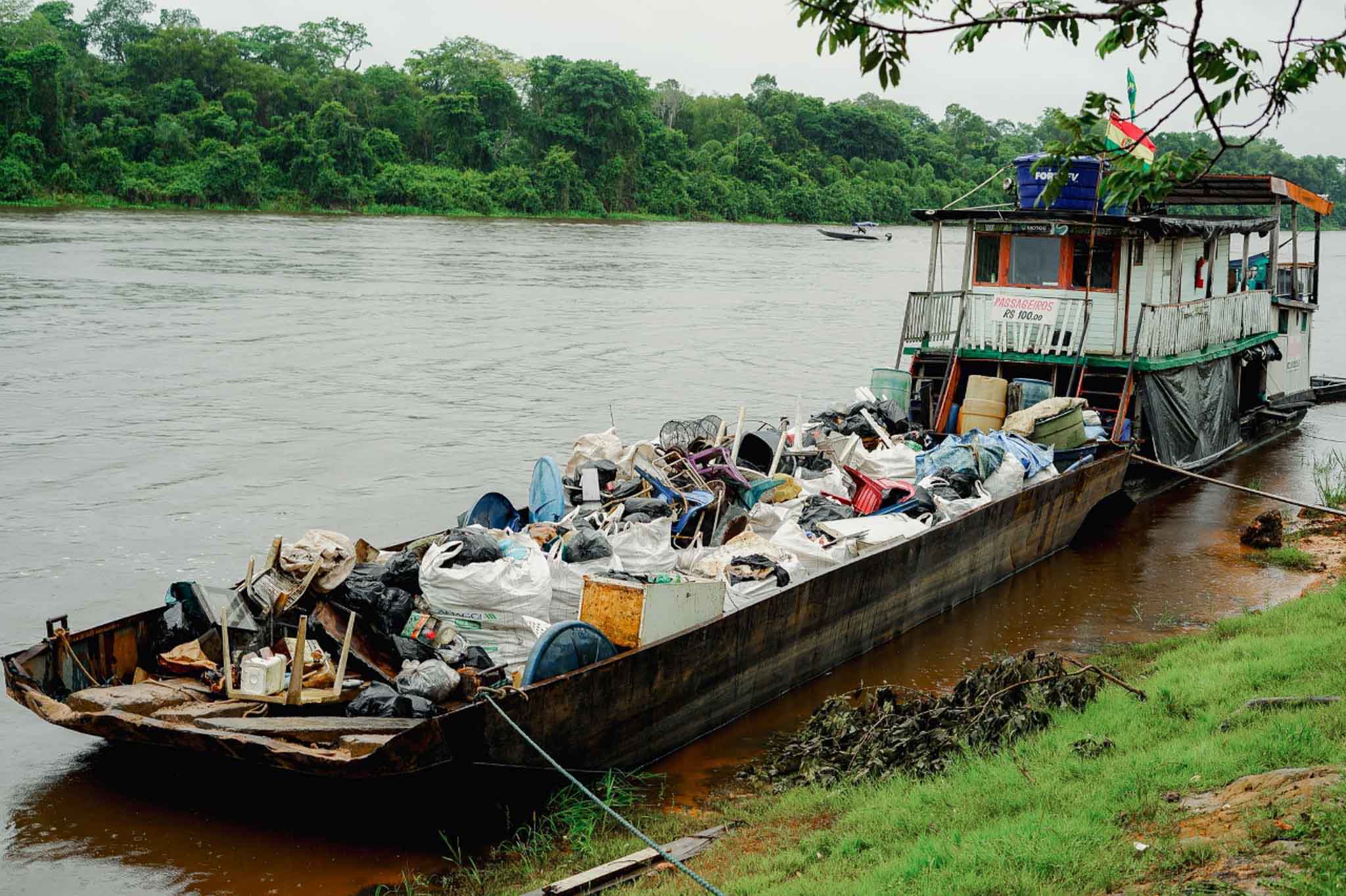 O barco atracou no porto da cidade, na sexta-feira, 22, quando foi realizada a coletiva para imprensa, que acompanharam a chegada da embarcação carregada de resíduos e o lançamento do projeto ’Plantar o Futuro’, de recuperação das áreas devastadas pelas queimadas em 2024.