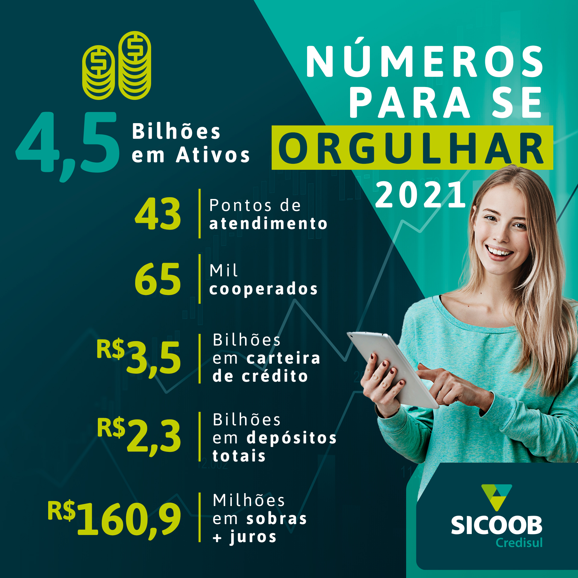 Em 2021, a Sicoob Credisul alcançou a marca de R$ 4,5 bilhões de ativos, um crescimento de 56,6%, que consolida sua força entre as cinco maiores cooperativas de créditos do Sistema Sicoob no país. Os demais indicadores da Sicoob Credisul também refletem a escalada do bom desempenho da instituição.