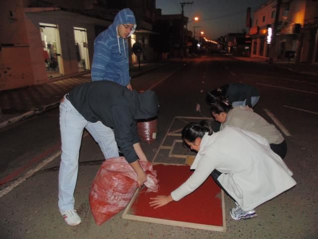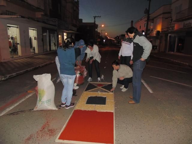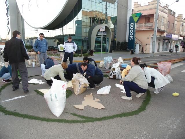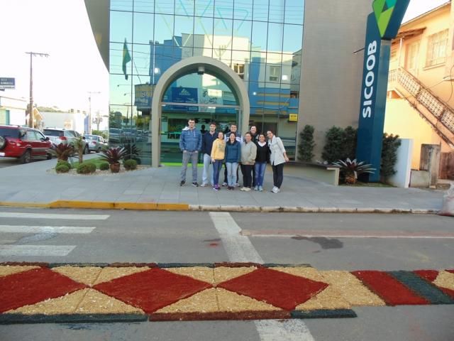 O gerente da agência do Sicoob Credisulca de Turvo, Gabriel Favarin Pescador, e os colaboradores Mauricio Pietsch Arcaro, Jéssica Matos, Maristela Contessi, Aroldo Stefani, Ricardo Guetner Moro, Cláudia Oliveira Esteves, Bruna Elias e Gislaine Fontoura tiveram um começo de quinta-feira diferente. Às 6 horas todos já estavam a postos em frente à agência para dar início à confecção dos tapes de Corpus Christi, que começou antes mesmo do sol aparecer. Tudo para deixar a rua pronta para a procissão religiosa, que passou pela frente da agência e da sede da cooperativa, que fica localizada na Rua Rui Barbosa, no Centro de Turvo.