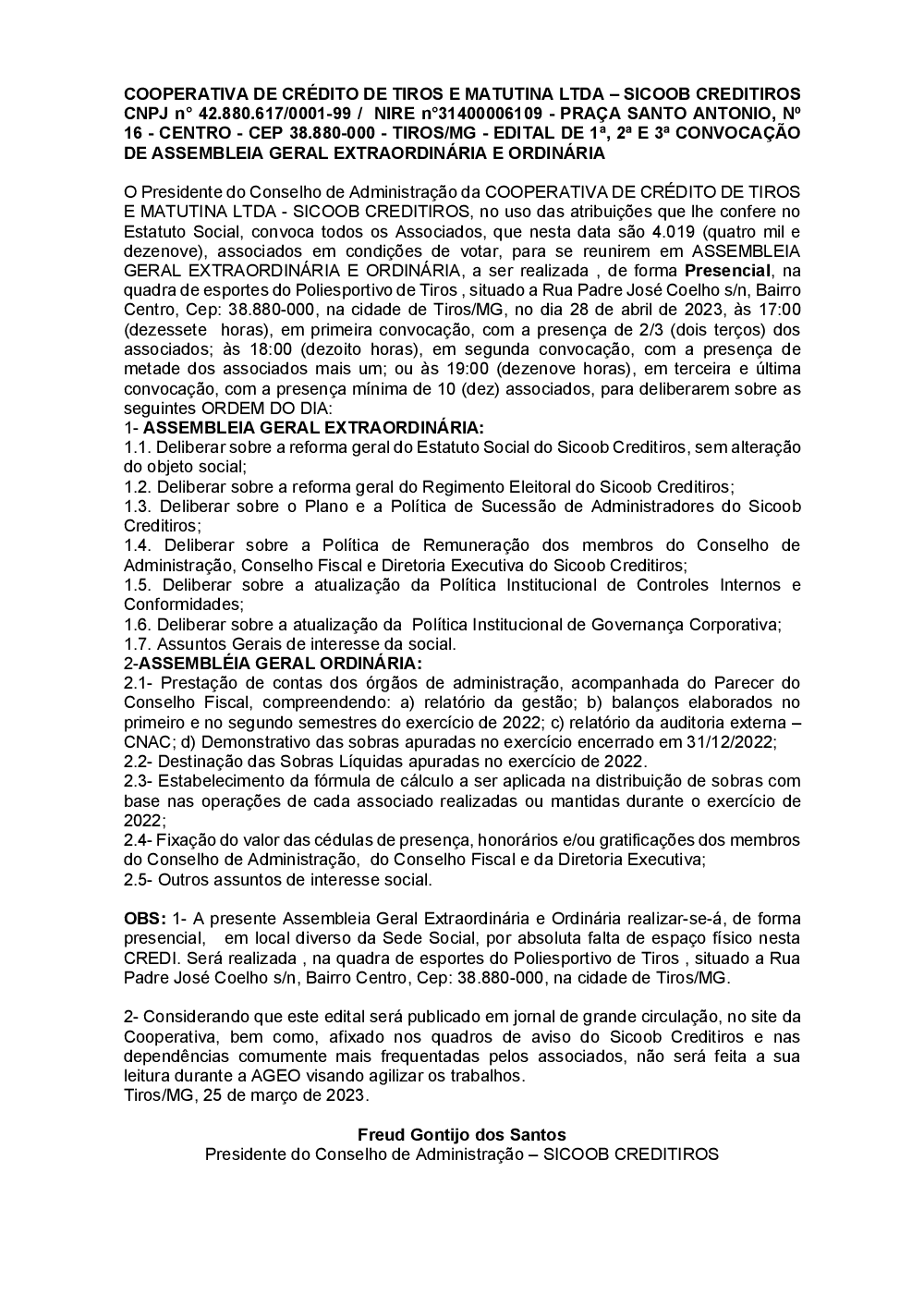 - Edital de convocação da Assembleia Geral Extraordinária e da Assembleia Geral Ordinária do ano de 2023 do Sicoob Creditiros.
