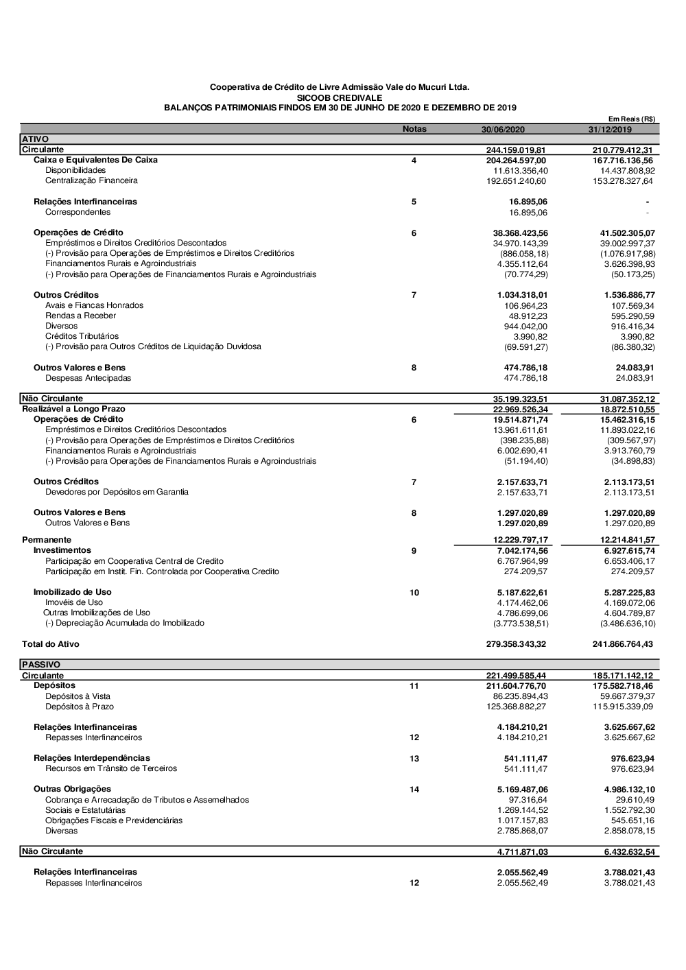 - BALANÇO PRIMEIRO SEMESTRE 2020 SICOOB CREDIVALE