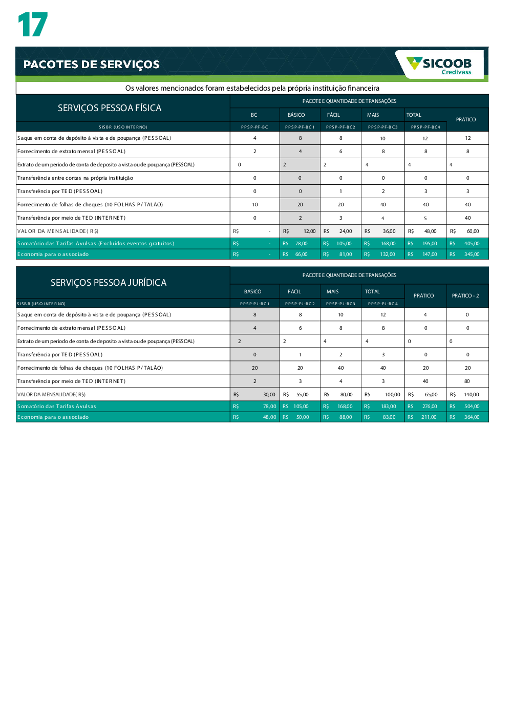 17 - PACOTE DE TARIFA - SICOOB CREDIVASS