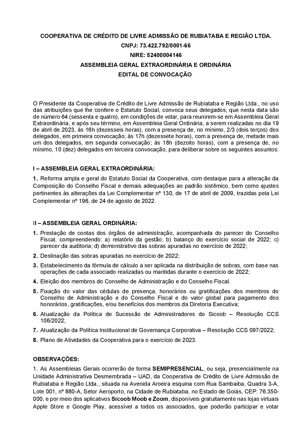 Edital de Convocação da Assembleia Geral Extraordinária e Ordinária 2023 - Sicoob Do Vale