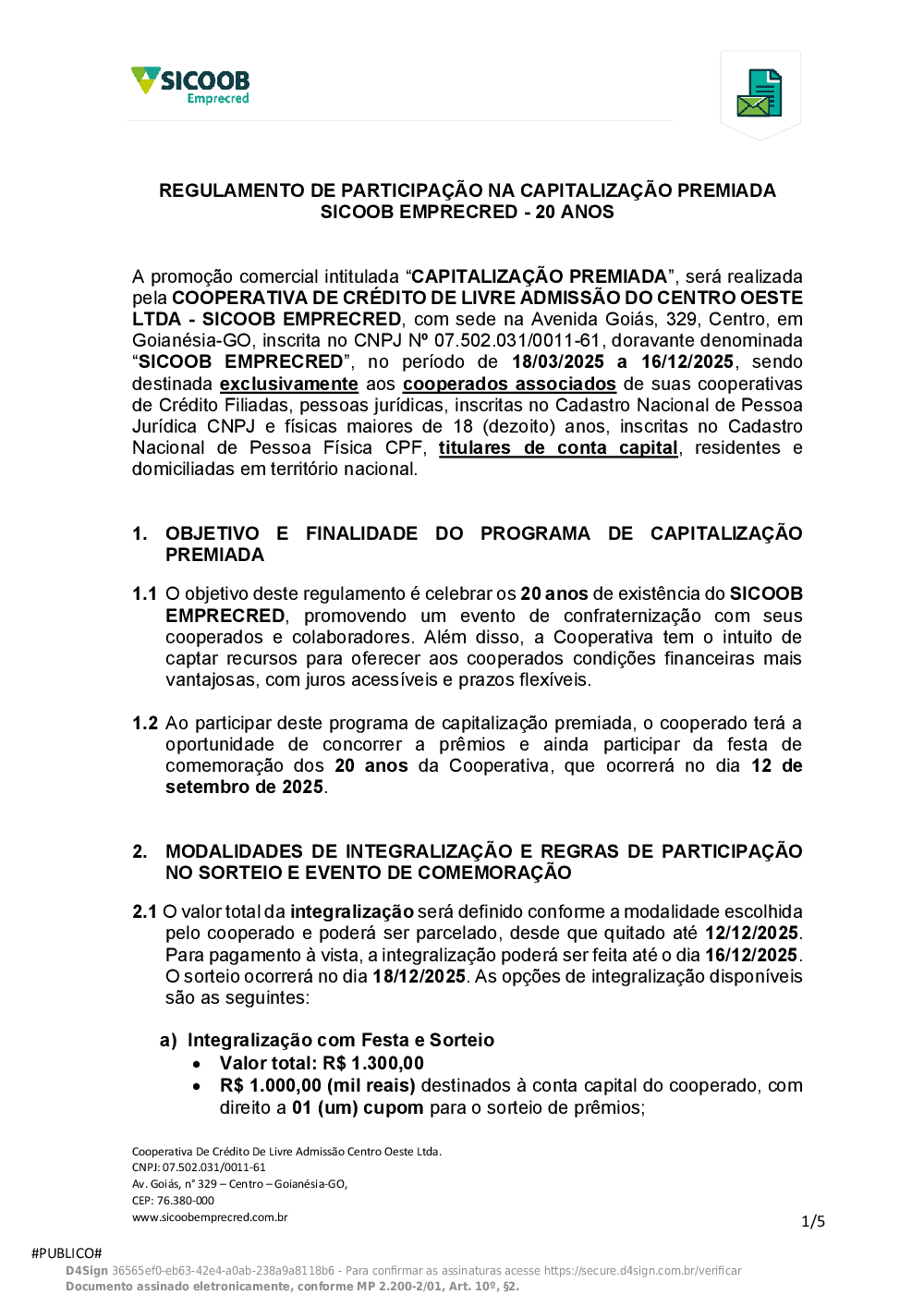 Regulamento da campanha Capitalização Premiada - Sicoob Emprecred 20 anos