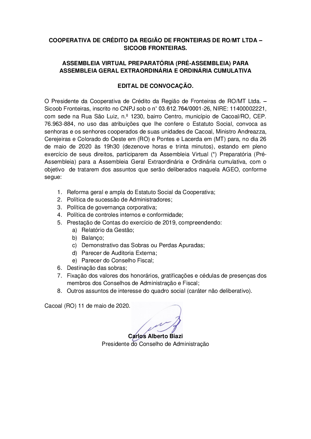 - Edital de convocação da Pré-Assembleia - Maio de 2020.