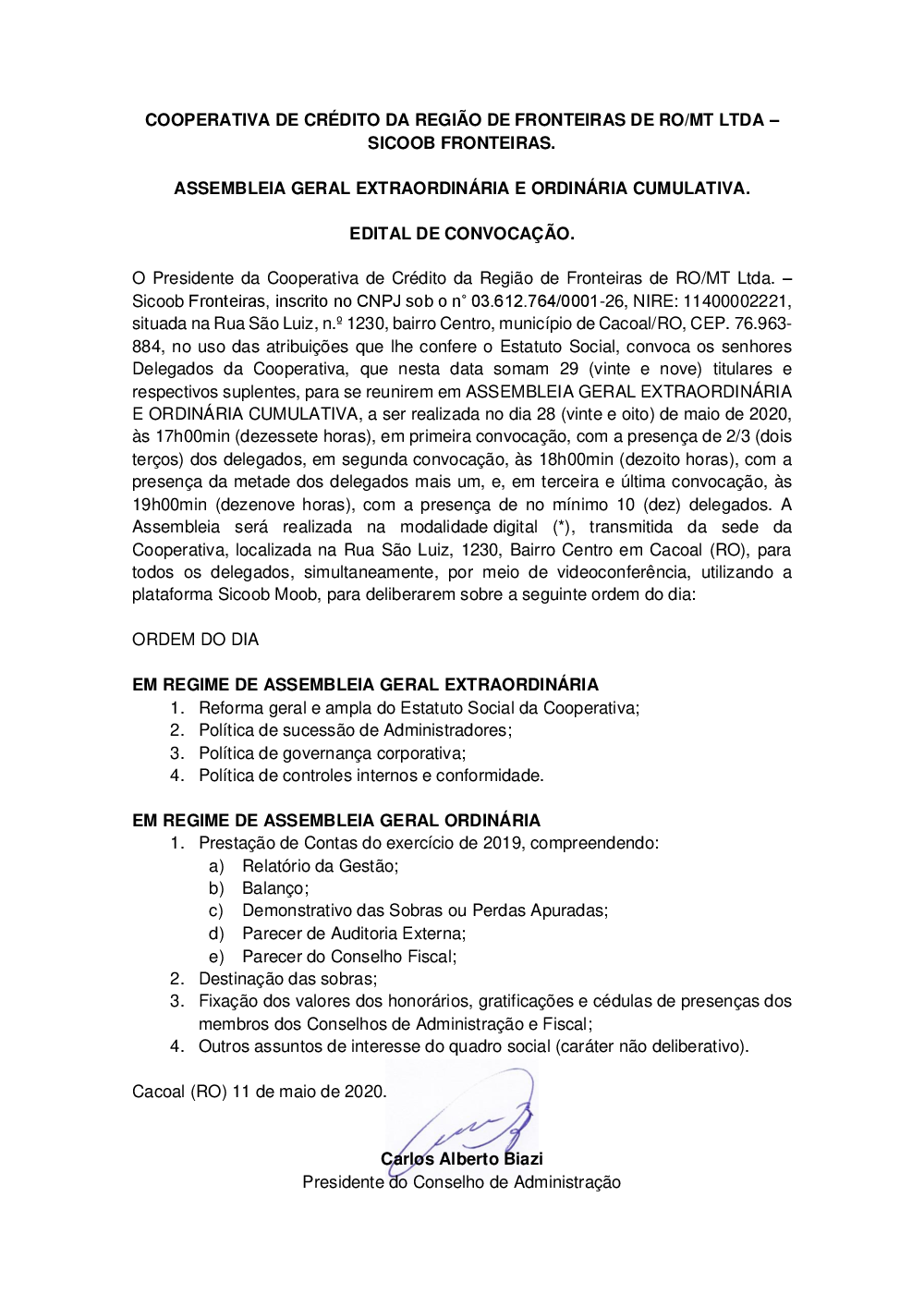 - Edital de convocação da Assembleia Geral Ordinária Extraordinária - Maio de 2020.