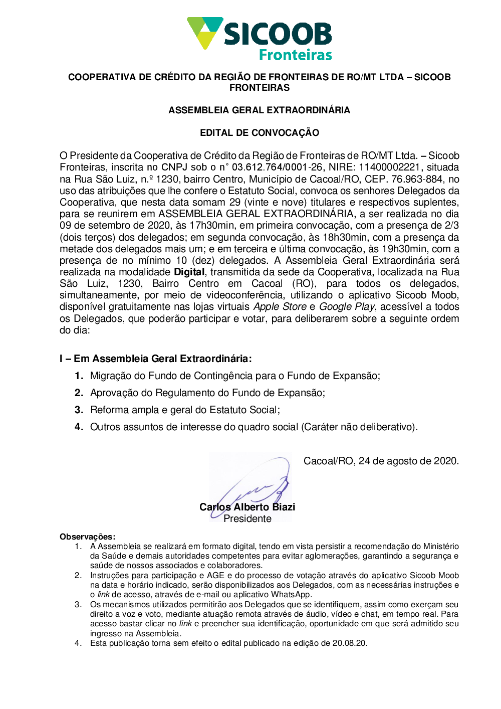 - Edital de convocação da Assembleia Geral Extraordinária - Setembro de 2020.