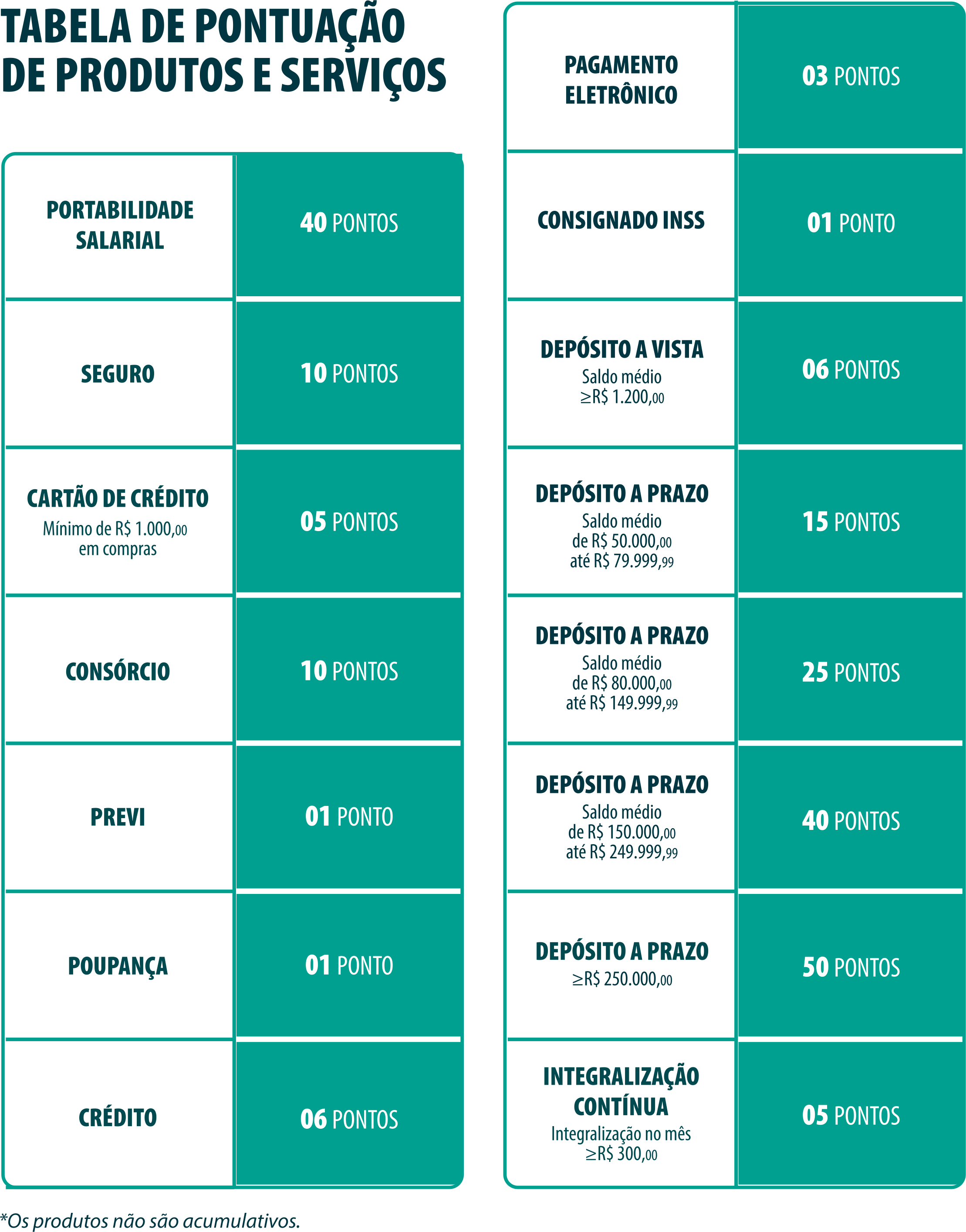 4. A pontuação é referente a produtos vigentes no mês anterior, e encontram-se ativos até a apuração no dia 20 de cada mês;