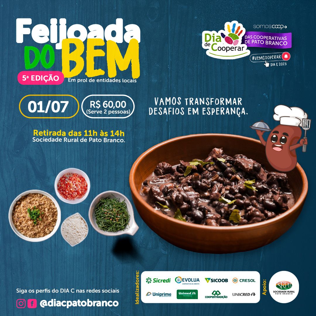 Será realizada no próximo dia 01/07, em Pato Branco, a quinta edição da Feijoada do Bem, evento beneficente promovido por um grupo de cooperativas locais por conta do Dia de Cooperar, o Dia C. A feijoada será no formato drive-trhu, e a entrega dos kits será na Sociedade Rural de Pato Branco, entre às 11h e às 14h.