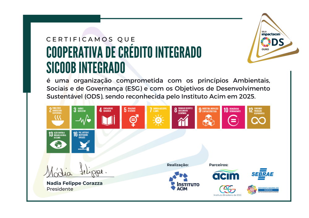 Pelo segundo ano consecutivo, o Sicoob Integrado foi reconhecido pelo Instituto ACIM com o Selo Impactacim na categoria Ouro, o mais alto nível da Certificação ODS (Objetivos de Desenvolvimento Sustentável).