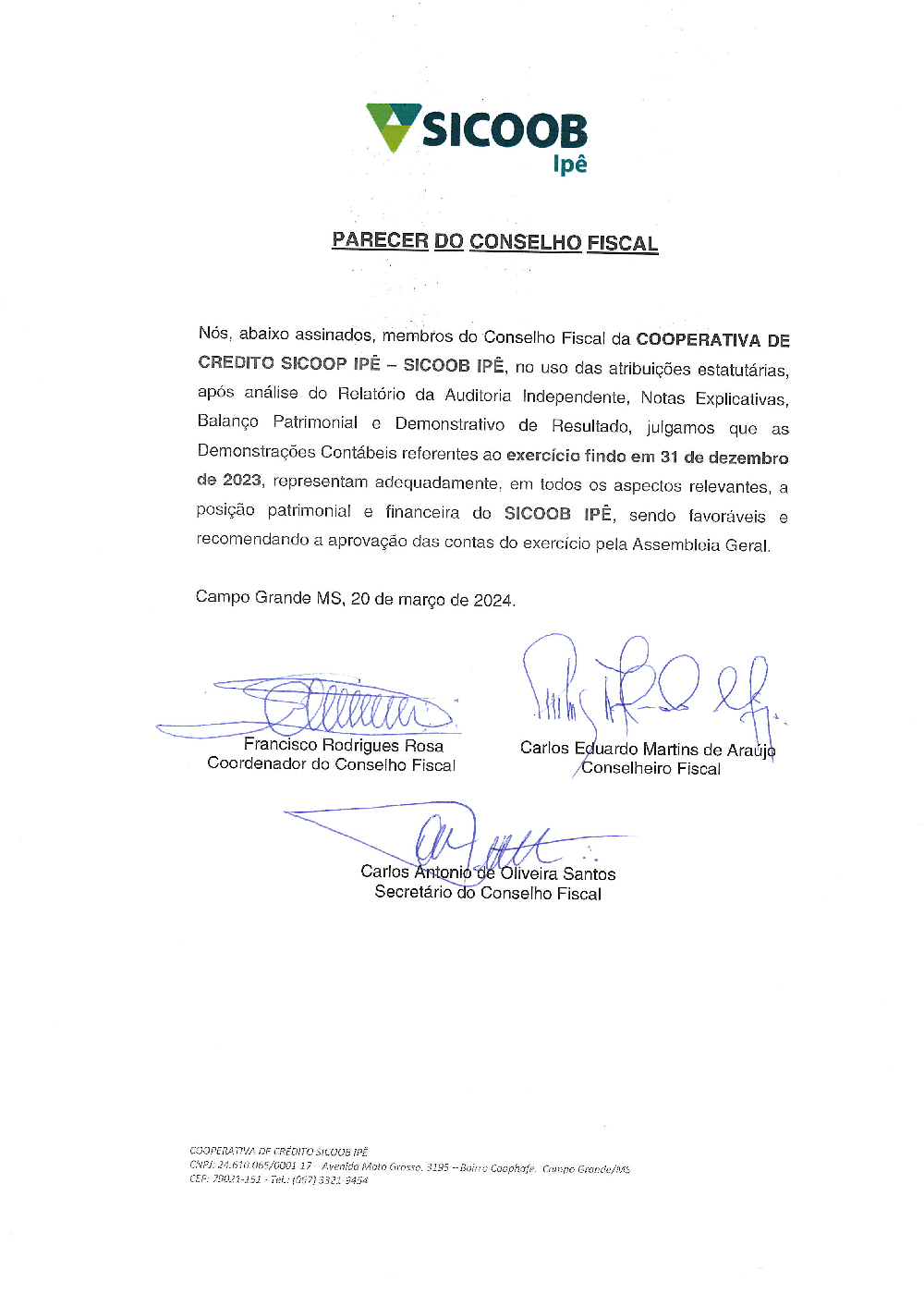 - Parecer do Conselho Fiscal sobre a prestação de contas de 2023