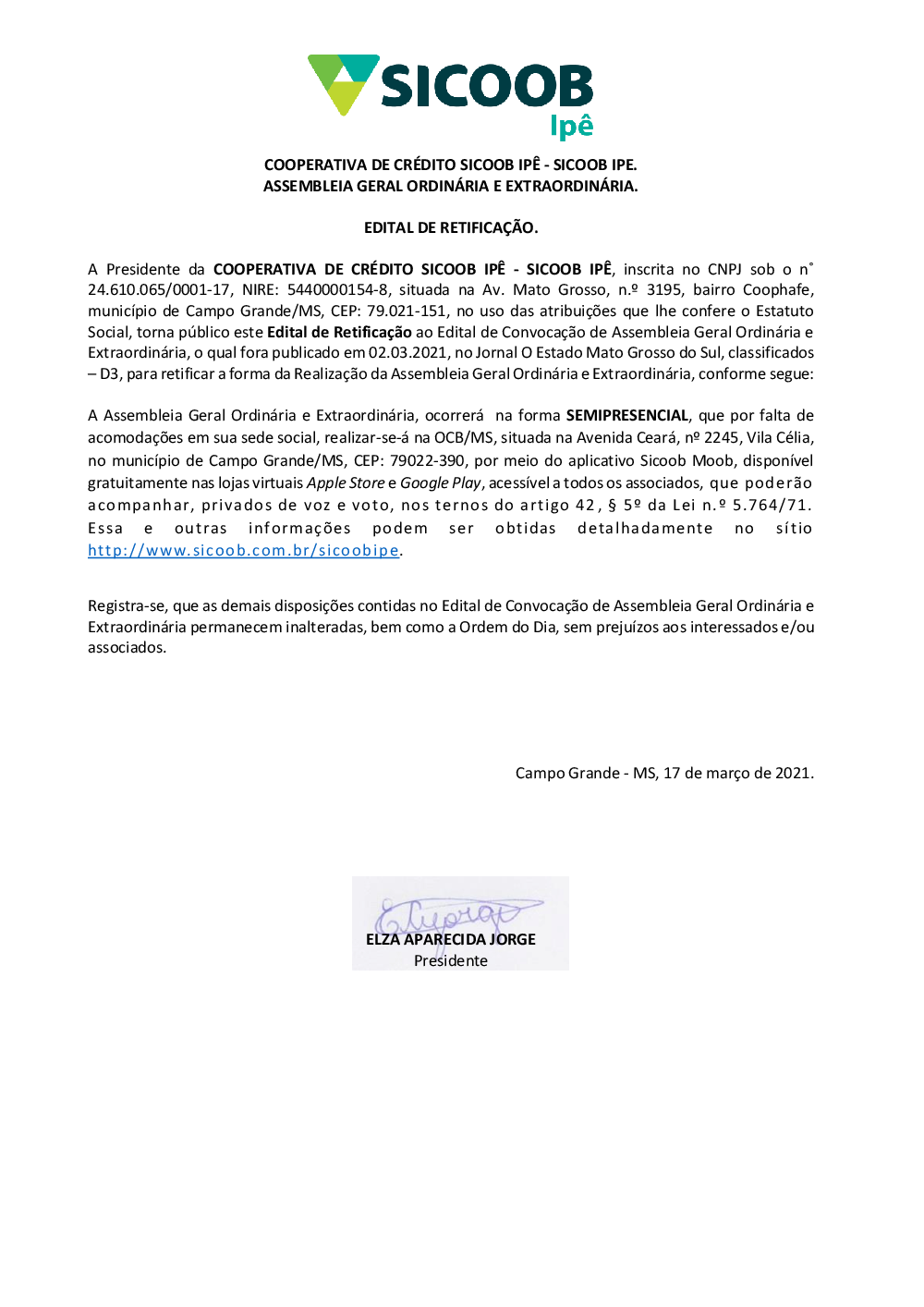 - Edital da primeira retificação da Assembleia 2021, publicado no dia 18/03/2021 no jornal O Estado de MS, com alteração para o formato SEMIPRESENCIAL, em razão do agravamento da pandemia do coronavírus.