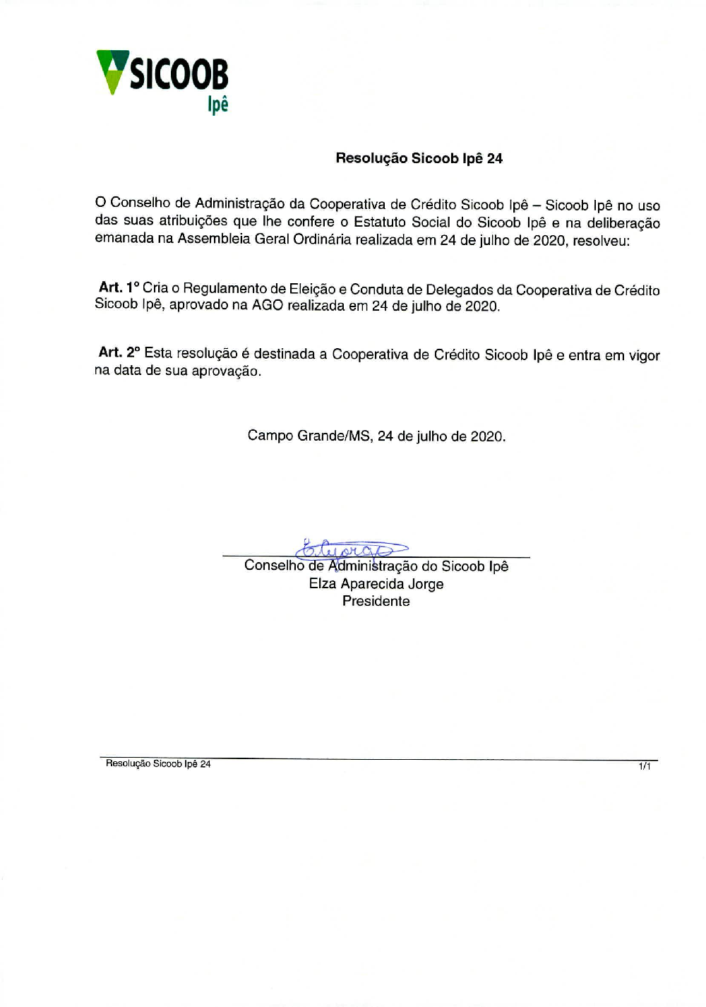 - Cria o Regulamento de Eleição e Conduta de Delegados da Cooperativa de Crédito Sicoob Ipê, aprovado na AGO realizada em 24 de julho de 2020.