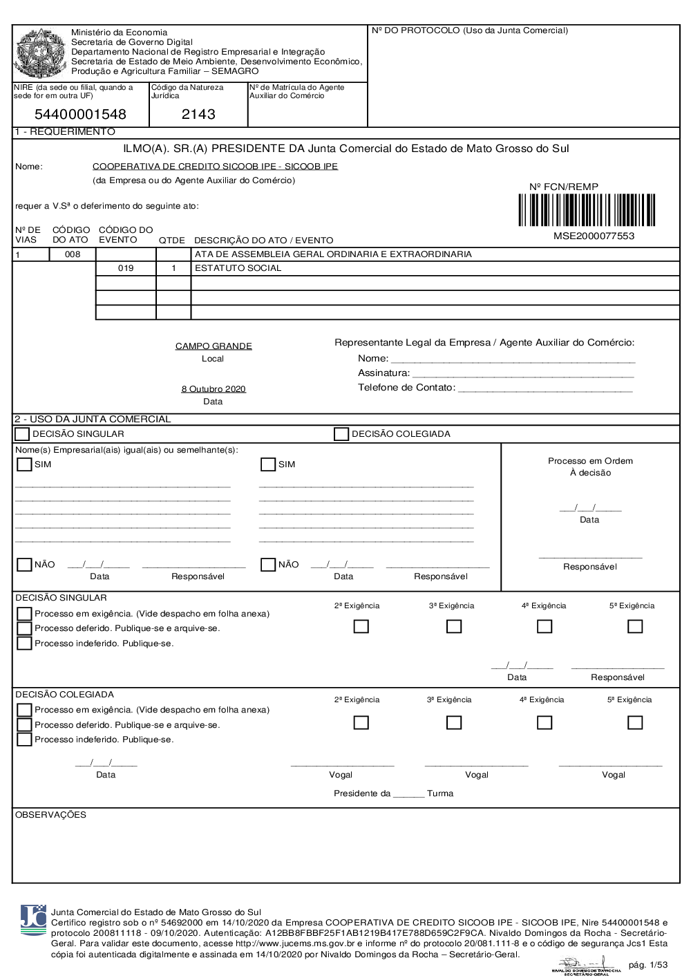 Ata da AGOE de 24/07/2020 e Estatuto Social homologados pelo BACEN e registrados na Junta Comercial de MS
