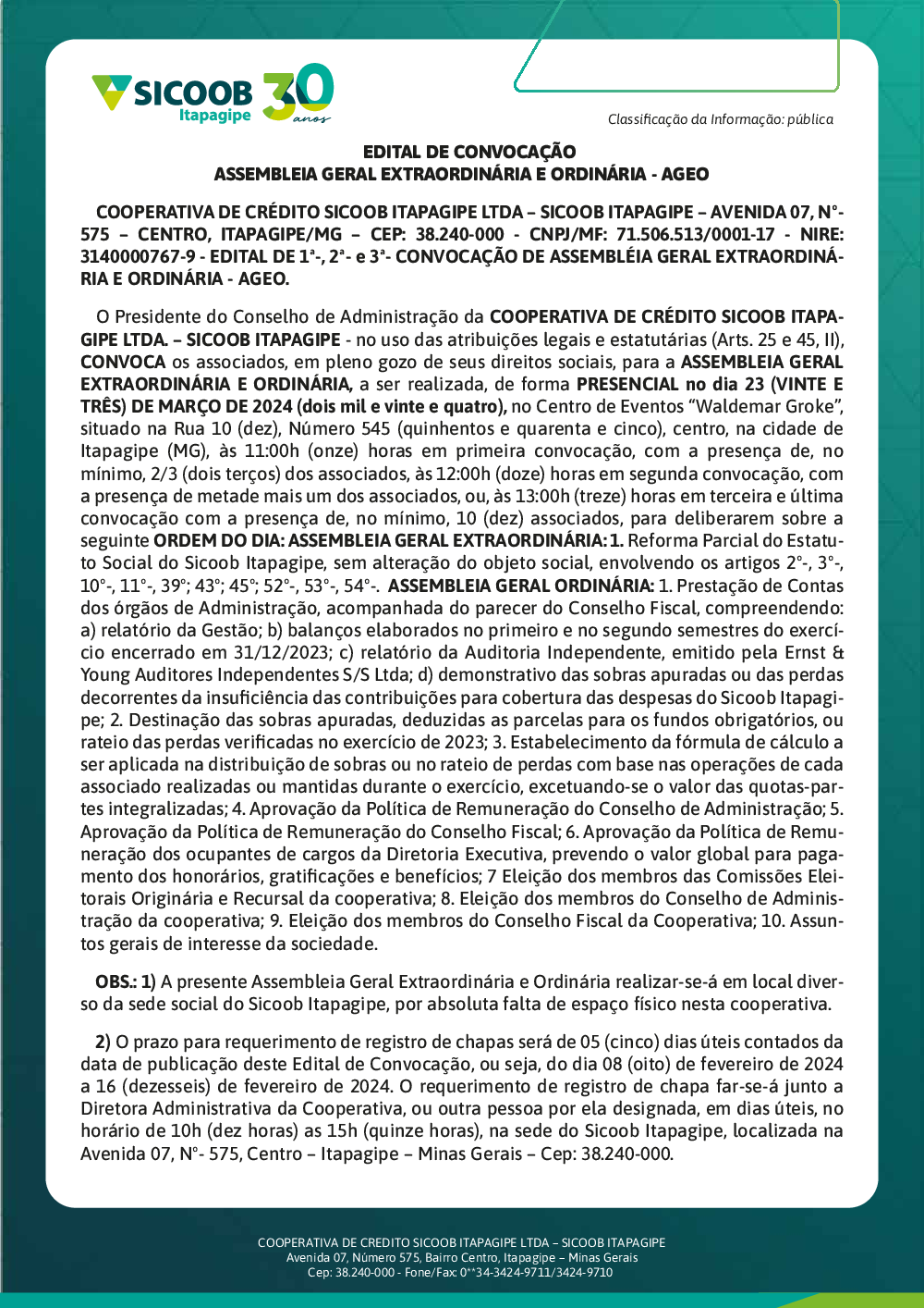 EDITAL DE CONVOCAÇÃO - AGEO 2024 - SICOOB ITAPAGIPE