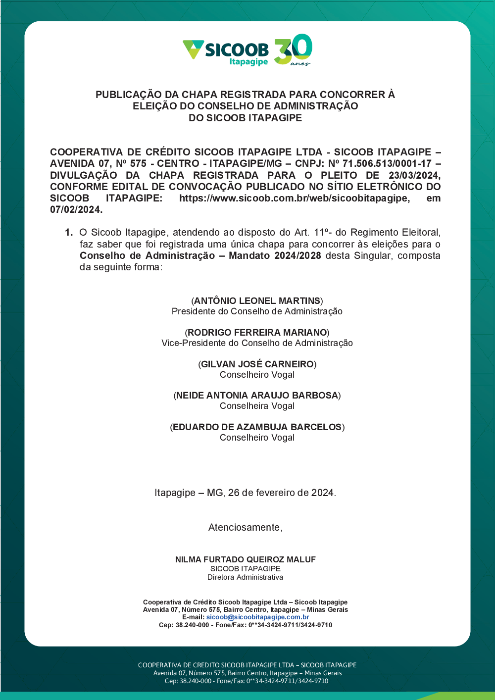CHAPA REGISTRADA PARA CONCORRER À ELEIÇÃO DO CONSELHO DE ADMINISTRAÇÃO