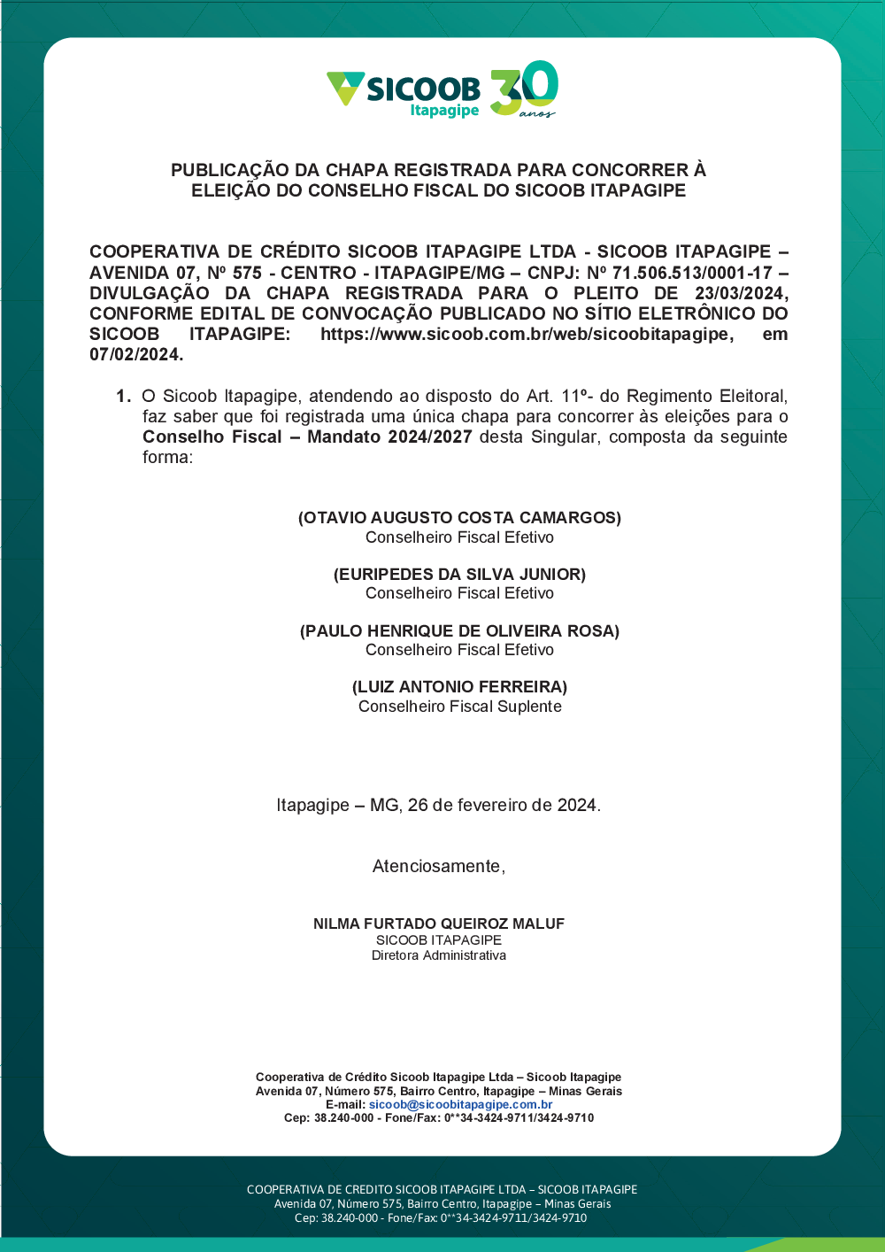 CHAPA REGISTRADA PARA CONCORRER À ELEIÇÃO DO CONSELHO FISCAL
