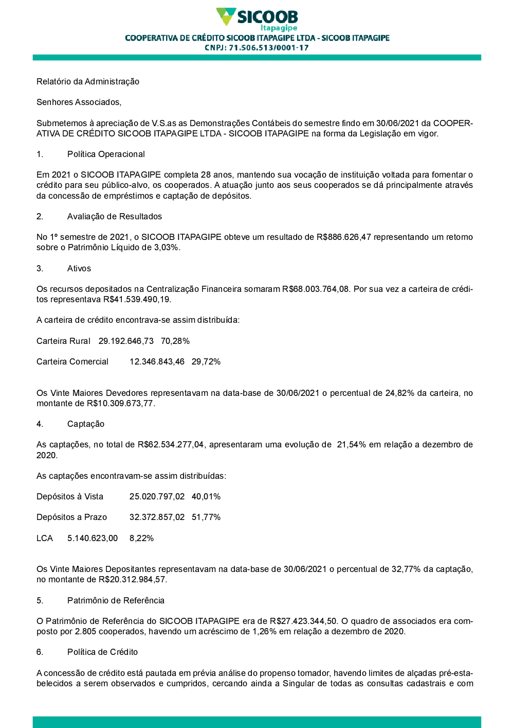 2021 (1º semestre) - Demonstrações Contábeis - Sicoob Itapagipe