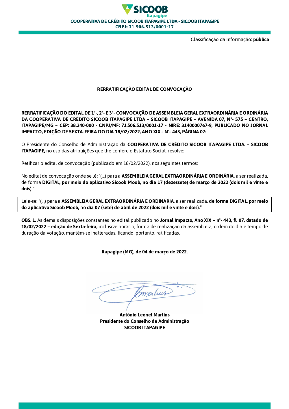 AGEO 2022 – RERRATIFICAÇÃO DO EDITAL DE CONVOCAÇÃO
