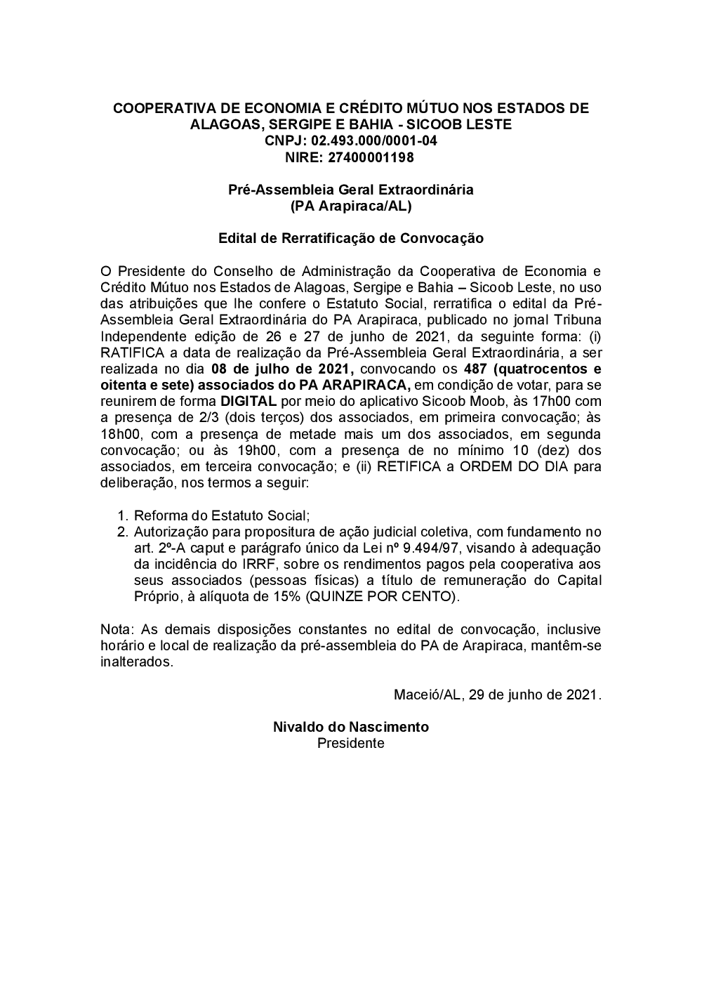 Arapiraca.AL - Edital de rerratificação de convocação Pré-Assembleia.pdf