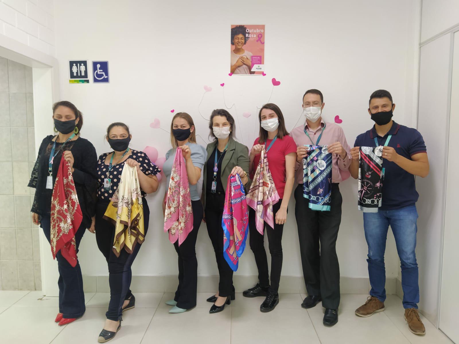 E para fechar este Outubro Rosa, mês que marca as ações de conscientização pela importância do cuidado com a saúde das mulheres, a equipe da agência do Sicoob do bairro Jardim Itália se reuniu para arrecadar lenços coloridos para as mulheres que passam por tratamento e são atendidas na Rede Feminina de Chapecó. A entrega foi na quarta-feira (27).
