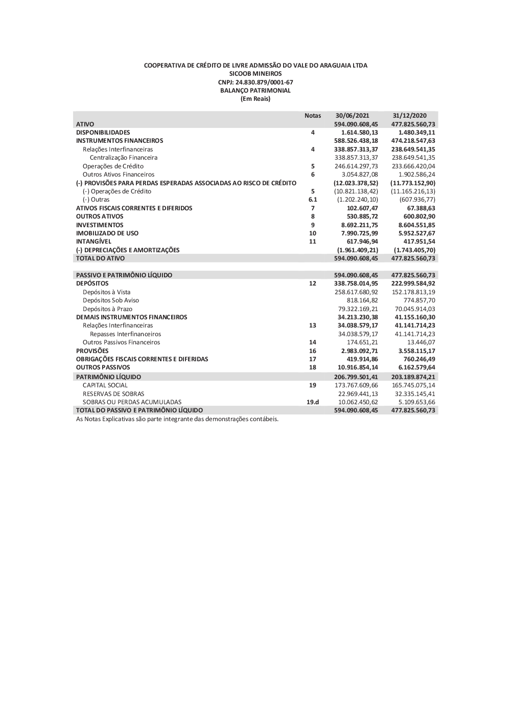 Demonstrações Contábeis - Sicoob Mineiros 30.06.2021