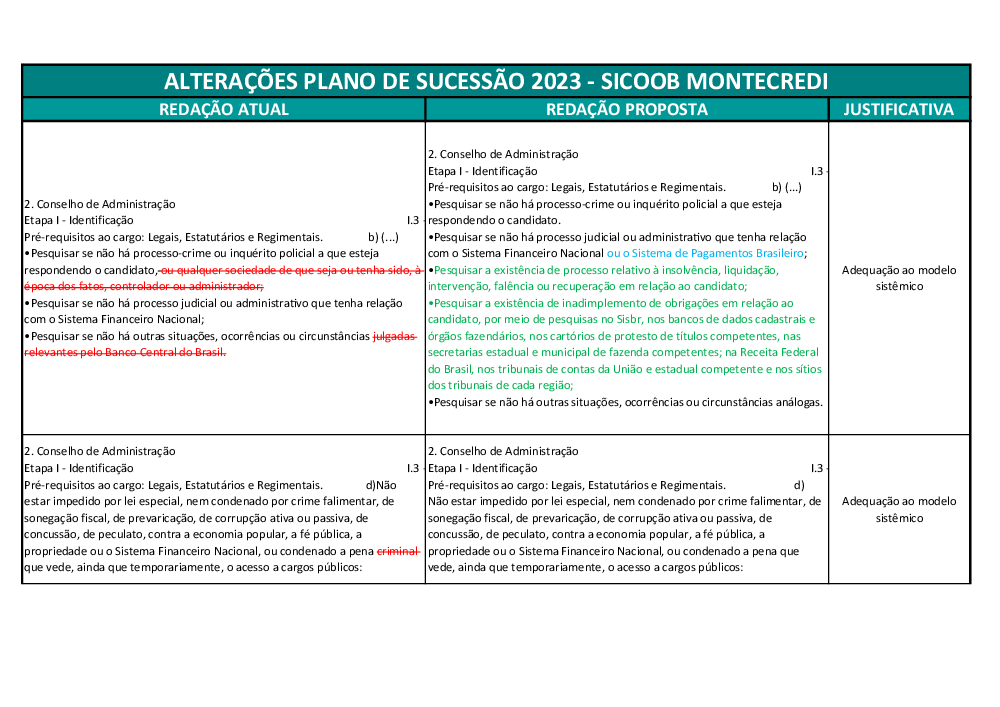Quadro de Alterações do Plano de Sucessão de Administradores do Sicoob Montecredi