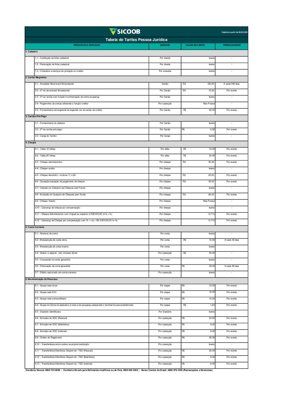 Tabela de Tarifas Pessoa Jurídica
