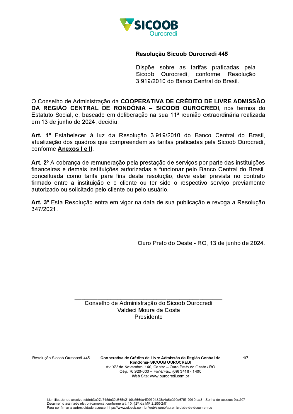 RCA 445 2024 - Dispõe sobre tarifas praticadas pela Sicoob Ourocredi 1.pdf