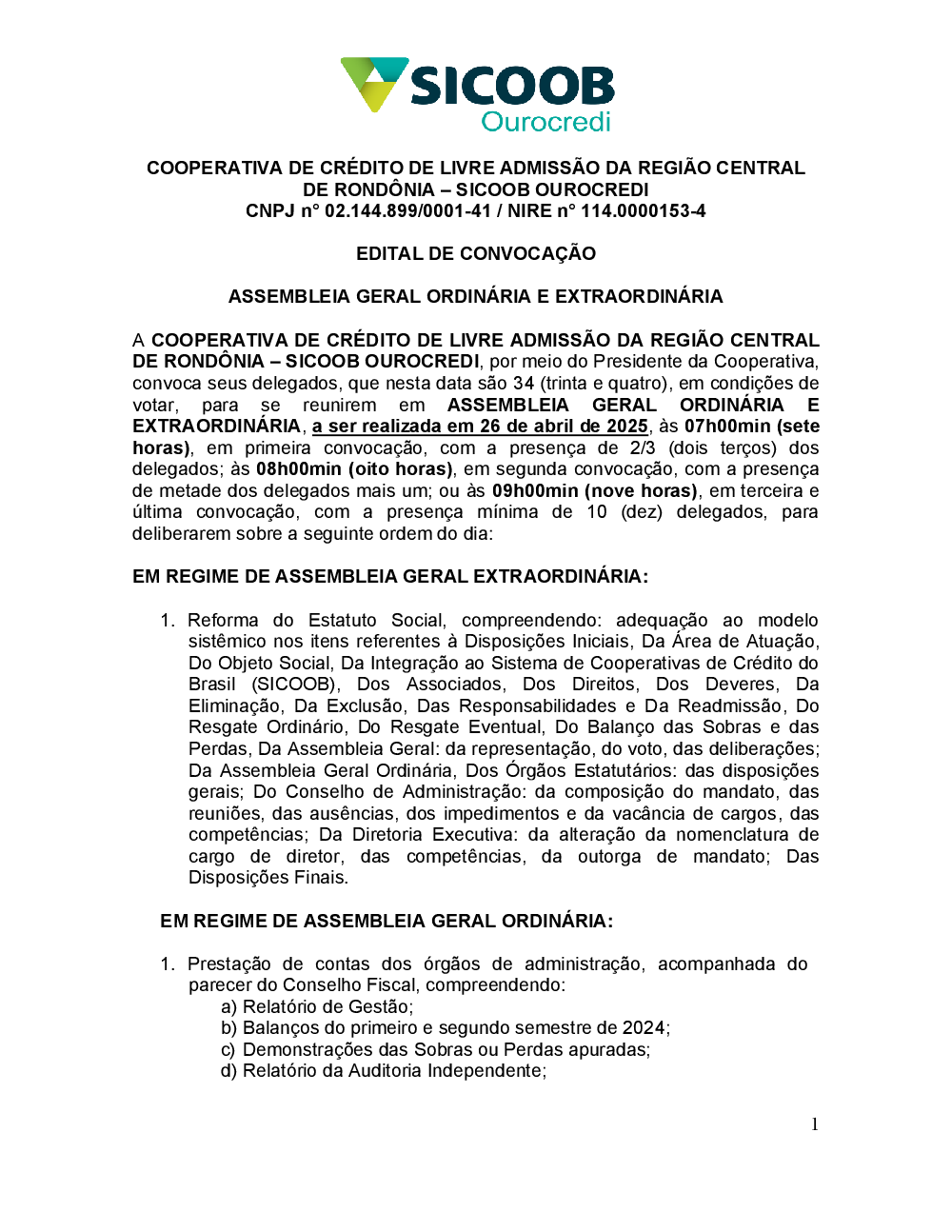 EDITAL DE CONVOCAÇÃO AGOE 2025 - SICOOB OUROCREDI