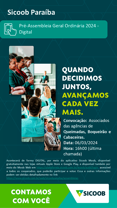 - Prezado(a) informamos que no dia 06/03/2024 às 16h ocorrerá à Pré-Assembleia Ordinária - DIGITAL, por meio do app Sicoob Moob ou Moob Web. Sua presença é essencial, participe!