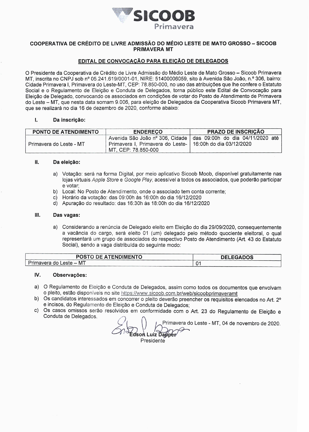 Edital - Eleição de Delegados - Sicoob Primavera MT