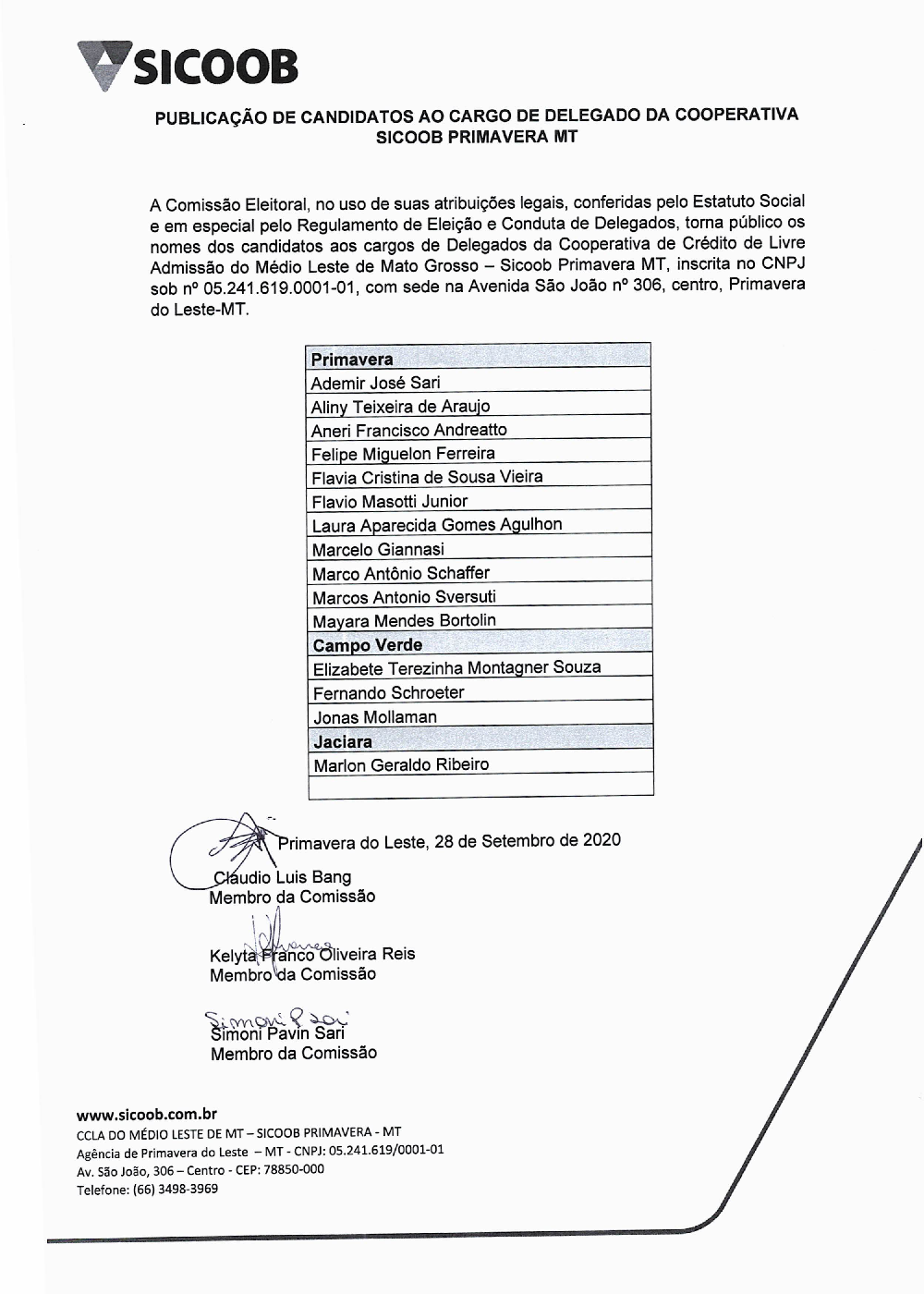 Relação de Candidatos a delegados Sicoob Primavera MT