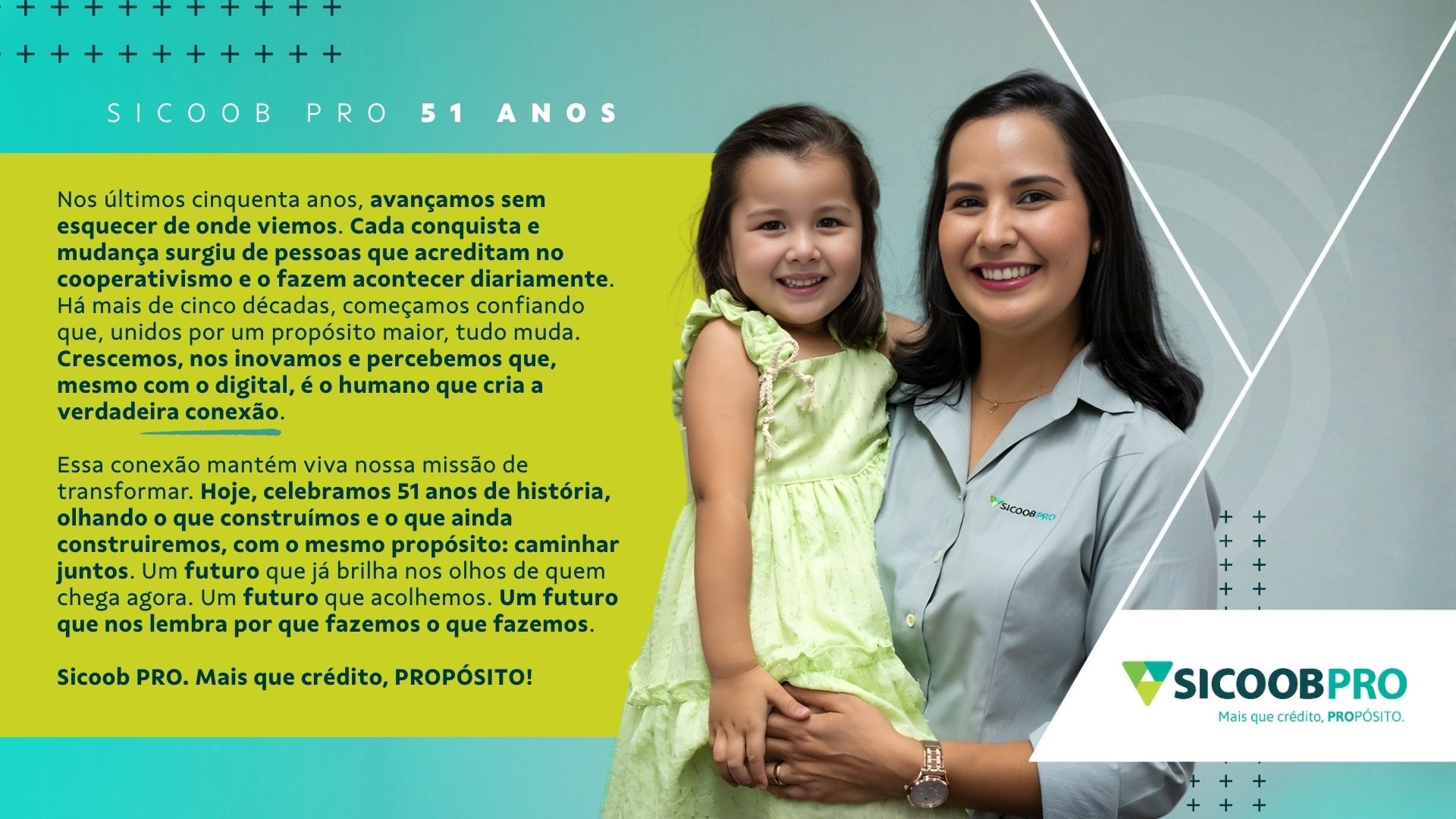 O Sicoob PRO celebra, neste 15 de dezembro de 2025, 51 anos de uma história guiada pela cooperação e pela transformação de vidas. Para marcar a data, uma campanha foi lançada. A campanha simboliza dois movimentos essenciais: a reafirmação do propósito que sustenta a Cooperativa e a visão de futuro que orienta seu próximo ciclo. Mais conectada às pessoas, mais humana e alinhada às mudanças do tempo, a campanha marca o início de uma nova etapa, sem perder de vista aquilo que sempre esteve na essência do Sicoob PRO.