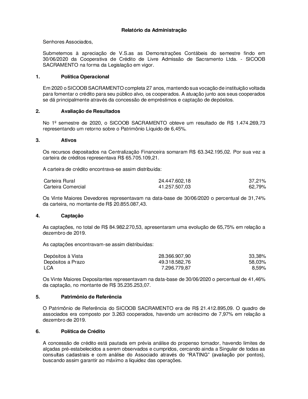 - Com o objetivo de melhor informar os participantes e dar transparência às suas ações, o Sicoob Sacramento divulga aqui as demonstrações contábeis a partir do 1º Semestre do ano 2020.
