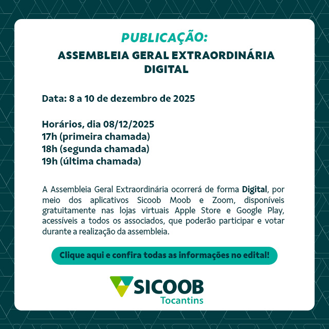 Sicoob Tocantins realiza Assembleia Geral Extraordinária Digital 2025 entre os dias 8 e 10 de dezembro